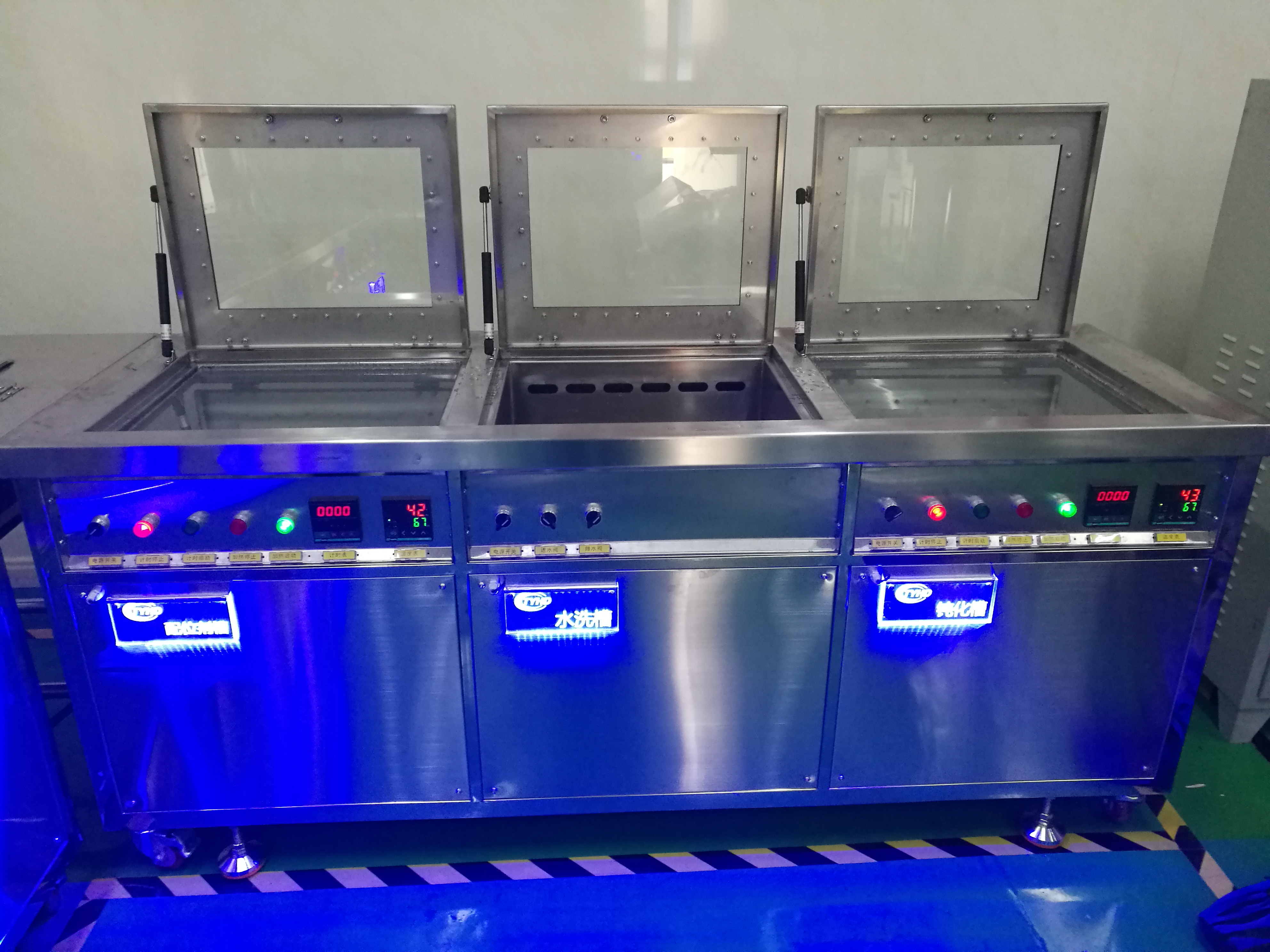 三、設備描述:該設備是一套超聲波清洗及熱風烘干組成的可連續(xù)工作的超聲波清設備,由4個不銹鋼材質制作的超聲波除油清洗槽、超聲波精洗槽、超聲波漂洗槽、熱風烘干槽首先由人工將需要清洗的工件放入料筐中開啟超聲波系統(tǒng)對工件進行表面的落塵等附著物的清洗,完畢后再把超聲波清洗槽中的料筐吊出放入到漂洗槽中進行漂洗,漂洗完畢后把工件提出依次類推,工件在熱風烘干之前先讓工作人員對工件進行壓縮空氣吹水再進入到烘干槽進行工件的烘干,完畢后吊出料筐完成清洗工作。